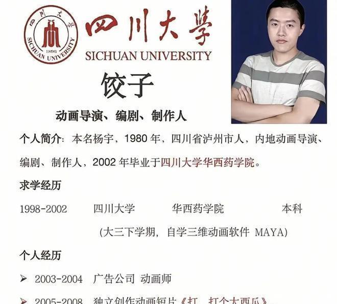 导演饺子(杨宇),四川大学华西药学院毕业,自学动画软件,十足非西席有方,如今靠着哪吒系列的两部电影就成为了百亿票房的导演