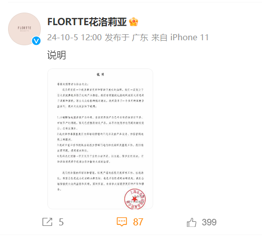 彼时FLORTTE花洛莉亚方面承认:“这次事件暴判辨咱们里面培训责罚的不及以及在产物贪图、本色营销经过上的瑕疵。”