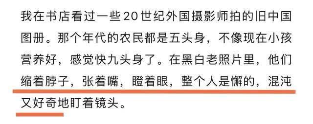 她用两句话概述了我方的不雅察,那技术许多农民五头身,养分不好,常常缩着脖子、张着嘴,通盘这个词是渺茫的、不知所措的,看着镜头是惊愕和奇怪的。