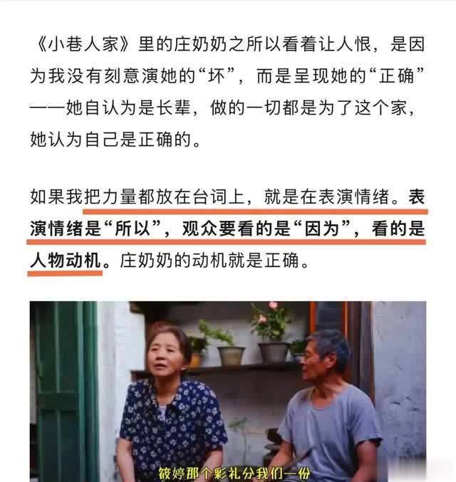 迟蓬对扮演的相识,如实是巨匠级别,聊到在《衖堂东说念主家》里出演的庄图南奶奶,这是一个招东说念主恨的变装,可她以为不该扮演情怀,台词仅仅一方面,更多要寻找东说念主物动机,找到东说念主物的魂,她为什么要这么?