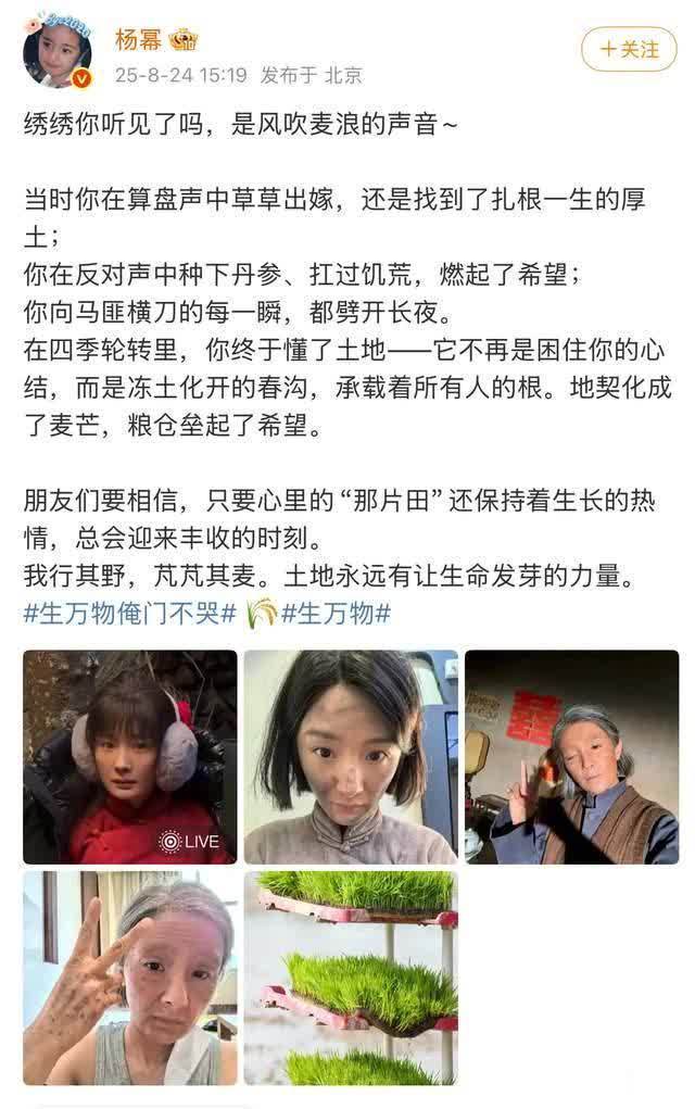 不同于杨幂在收官文中提到的“绣绣你听见了吗,是风吹麦浪的声息”之类抒怀文,迟蓬更多从扮演上领略大脚娘这个东说念主物。