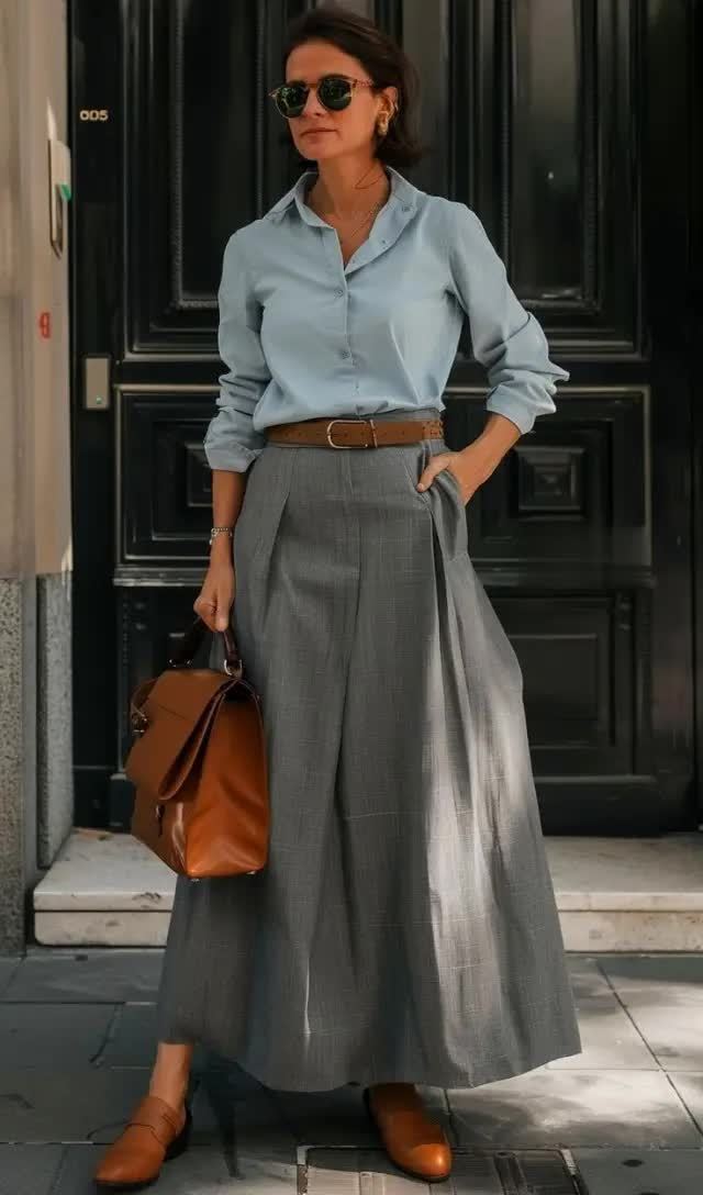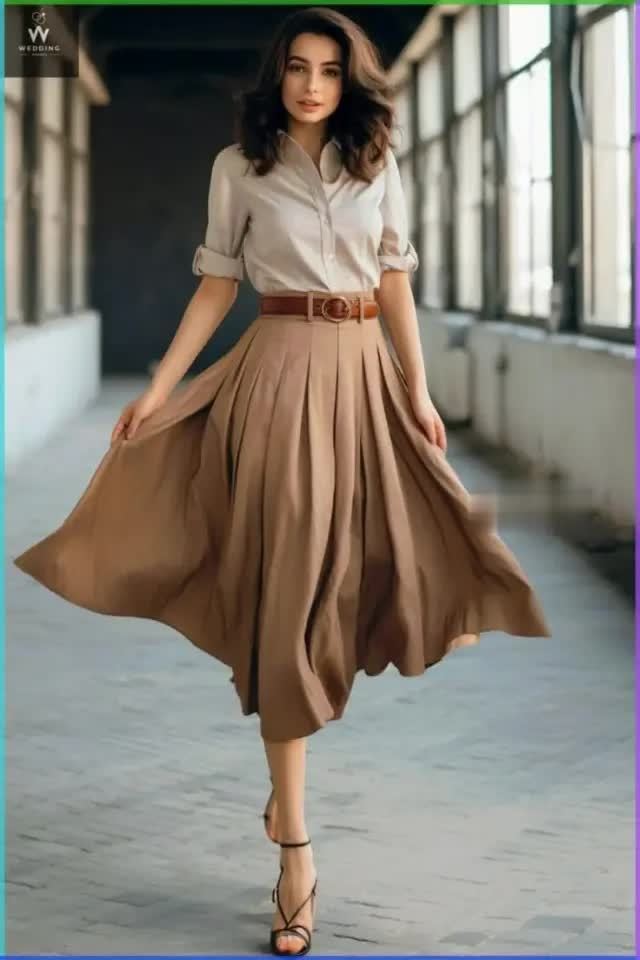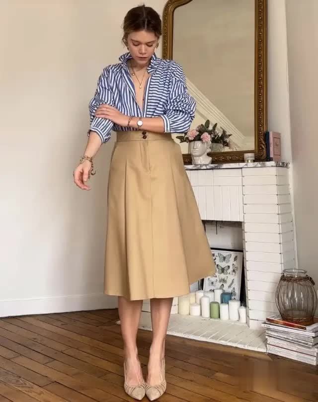 白衬衫、丝绸衬衫或棉麻衬衫都是“高腰压褶半裙”的好搭档。将衬衫束进裙子里,能了了地区别出腰线,显得干练利落。解开几颗纽扣,制造V领成果,还能拉长颈部线条,增添几分随心洒脱。