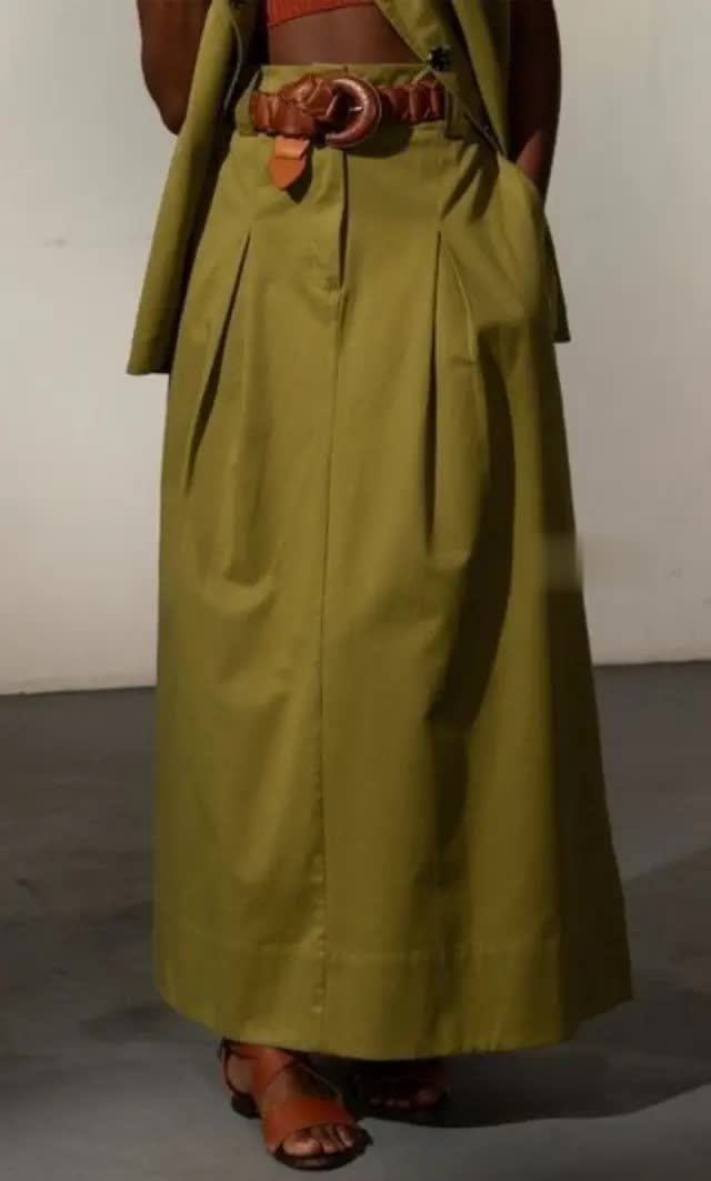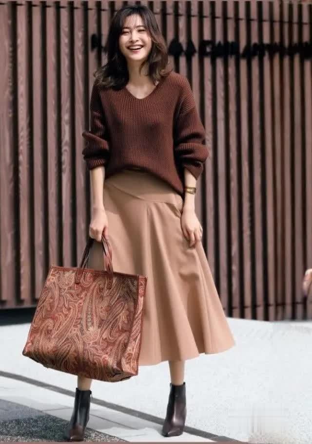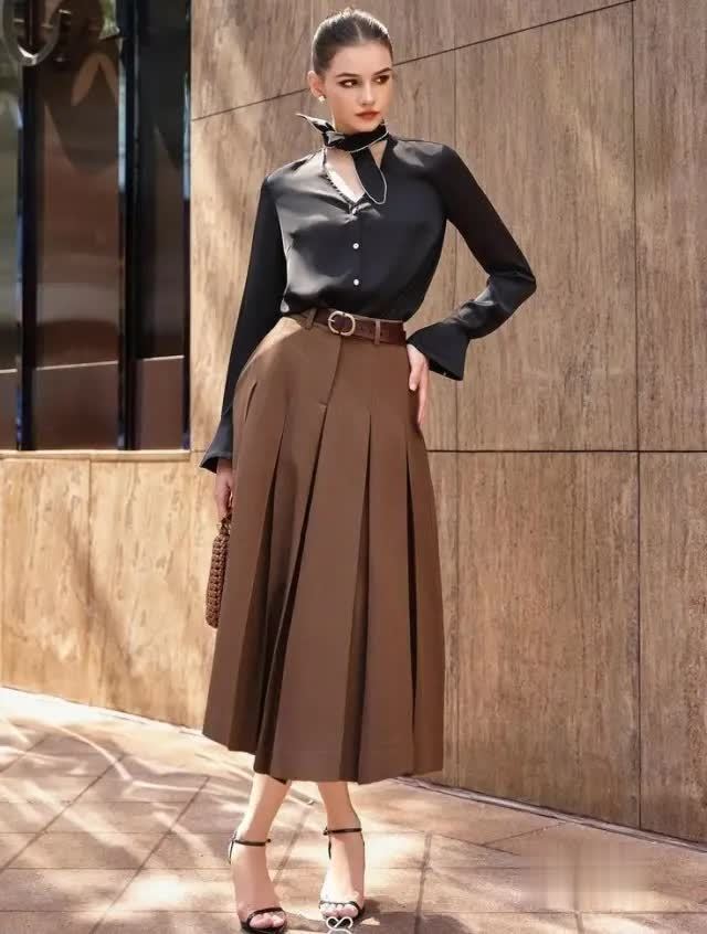 举例,一条焦糖色“高腰压褶半裙”搭配同色系或浅米色的上衣,全体造型和解长入,呈现出一种绝不勤恳的精良。