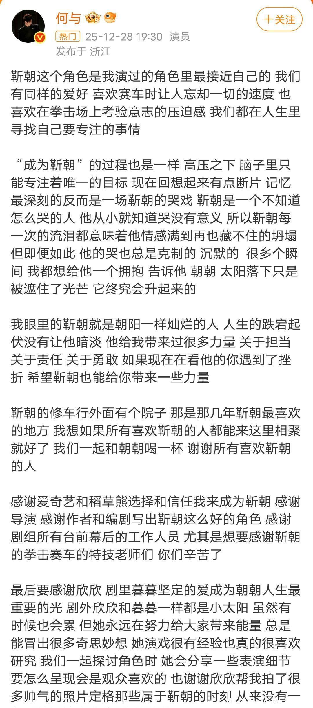 何与在《双轨》收官时发长晓谕别,坦言靳朝是我方演过最迫临高兴的变装,两东说念主分享对赛车速率和拳击压迫感的怜爱,实践与剧中在某一刻高度重合。
