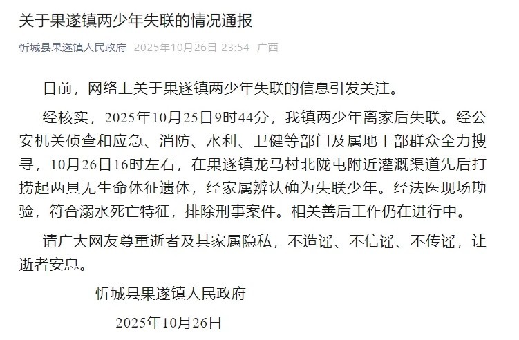 10月26日,广西客东说念主忻城县果遂镇东说念主民政府通报:日前,集聚上对于果遂镇两少年失联的信息激发关心。