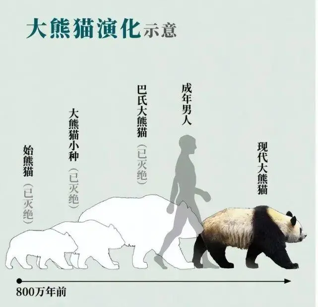 大熊猫的进化历程卓越约 800 万年,从始熊猫的杂食袖珍食肉动物,迟缓特化为专食竹子的植食性熊科特有种。